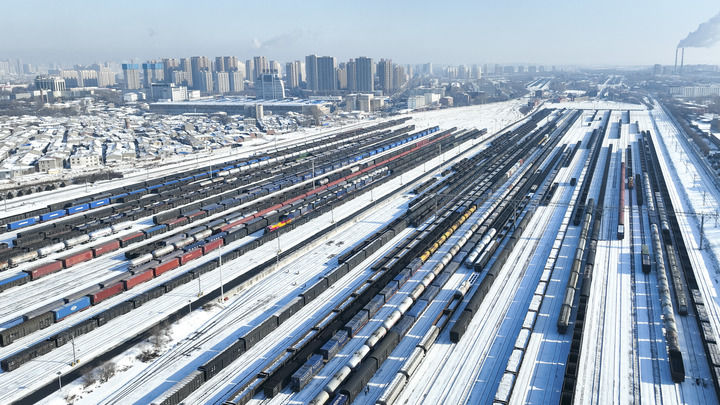 \n\t装满物资的货运列车在黑龙江省哈尔滨南站编组站场整装待发。“三九”天以来,针对北方降温降雪天气,中国铁路哈尔滨局集团有限公司哈尔滨南站积极开展电煤、生产物资保供专项行动,全力保障民生物资运输需求(2026年1月15日摄,无人机照片)。新华社发(原勇 摄)