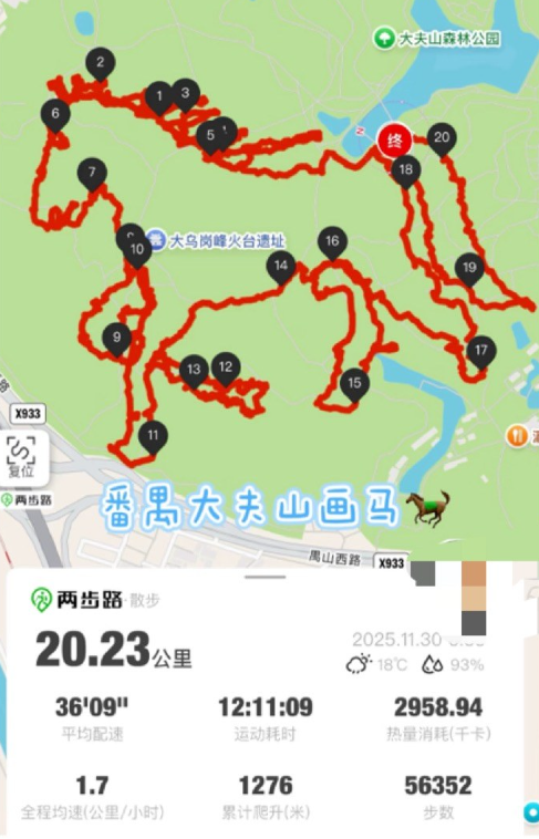 所谓“大夫山画马”,是指在广州番禺大夫山森林公园,参与者按特定轨迹行走,最终在地图上形成一匹马的图案。高峰期一天有上千人前来打卡。