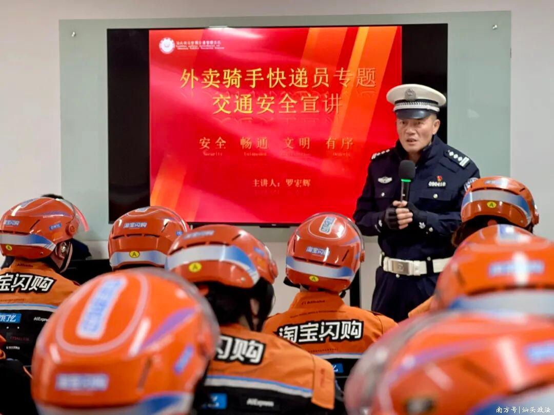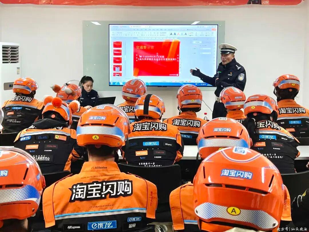 近日,汕头公安交管部门组织民警辅警走进淘宝闪购外马路驿站,开展交通安全宣教活动。
